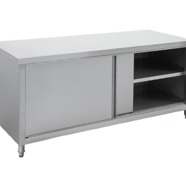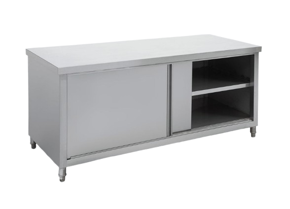 Featuring convenient sliding doors on one side (0.9mm stainless steel), this cabinet effectively hides clutter, maintaining a tidy environment ideal for open kitchens. Available in various widths, it delivers high-capacity food preparation space combined with essential internal security.